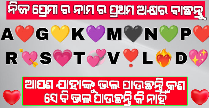 ବାଛନ୍ତୁ ନିଜ ସାଥିଙ୍କ ନାମର ପ୍ରଥମ ଅକ୍ଷର ଓ ଜାଣନ୍ତୁ ଆପଣ ଯାହାଙ୍କୁ ଭଲ ପାଉଛନ୍ତି ସେ ବି ଆପଣଙ୍କୁ ଭଲ ପାଉଛନ୍ତି କି ନାହିଁ ।
