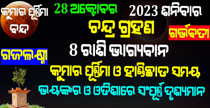ବନ୍ଧୁଗଣ ଆସନ୍ତା 28 ତାରିଖ ଶନିବାର ଦିନ କୁମାର ପୂର୍ଣ୍ଣିମା ବା ଗଜଲକ୍ଷ୍ମୀ ପୂଜା ଦିନ ବର୍ଷ 2023 ର ଅନ୍ତିମ ଚନ୍ଦ୍ରଗ୍ରହଣ ପଡୁଅଛି । ଏହି ଗ୍ରହଣ ଆଶ୍ଵିନ ମାସ ପୂର୍ଣ୍ଣିମାରେ ଲାଗୁଅଛି । ଏହି ଗ୍ରହଣ ତୁଳା ରାଶି ଓ ରେବତୀ ନକ୍ଷତ୍ରରେ ସଂଘଠିତ ହେବ । ଯାହା ଫଳରେ ତୁଳା ରାଶିର ବ୍ୟକ୍ତିଙ୍କ ଉପରେ ଏହାର ପ୍ରଭାବ ଦେଖିବାକୁ ମିଳିବ । ଆସନ୍ତୁ ଜାଣିବା କେମିତି କୁମାର ପୂର୍ଣ୍ଣିମା ପାଳନ ହେବ, ସମୟ ସୀମା, ସୁତକ ସମୟ କେବେ ପାଳନ ଓ ଶେଷ ହେବ, ଏହି ସମୟରେ କଣ କରିବେ ଓ କଣ ନାହିଁ ସେହି ବିଷୟରେ ଆଲୋଚନା କରିବା ।