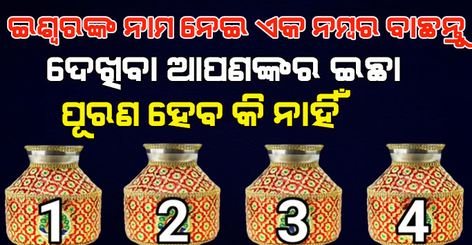 ବନ୍ଧୁଗଣ ଆପଣଙ୍କର ଯଦି କିଛି ଇଛା ରହିଛି । ତାହା ପୁରା ହେବ କି ନାହିଁ ତାହାକୁ ନେଇ ମନରେ ବହୁତ ଦ୍ଵନ୍ଦ ରହିଥାଏ । ତେବେ ଆପଣଙ୍କୁ ଏଠାରେ 4 ଗୋଟି ନମ୍ବର ଲେଖା ଥିବା କଳସ ଦିଆଯାଇଛି । 1, 2, 3 ଓ 4 ଏହି ନମ୍ବର ମଧ୍ୟରୁ କୌଣସି ଏକ ନମ୍ବରର କଳସ ବାଛିକି ଆପଣ ନିଜର ଇଛା ସମ୍ପର୍କରେ ଜାଣିପାରିବେ । ଯେ ଆପଣଙ୍କର ଇଛା ପୂରଣ ହେବ କି ନାହିଁ । ଯଦି ଇଛା ପୂରଣ ହେବ ତେବେ କେବେ ହେବ ଏହି ସବୁ ବିଷୟରେ ଟାରୋଟ କାର୍ଡର ରିଡିଙ୍ଗ ମାଧ୍ୟମରେ ଜାଣିପାରିବେ ।