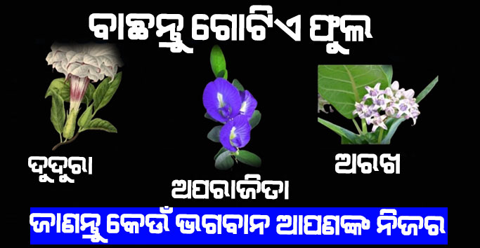ବନ୍ଧୁଗଣ ଆପଣ ମାନେ ବିଭିନ୍ନ ପ୍ରକାରର ଫୁଲ ନିଶ୍ଚୟ ଦେଖିଥିବେ । ବିଭିନ୍ନ ପ୍ରକାରର ଫୁଲ ର ନାଁ ମଧ୍ୟ ରହିଛି । ପୂଜା ରେ ଫୁଲ ର ବ୍ୟବହାର ଅଧିକ କରାଯାଏ । ଆଜି ଆମେ ଆପଣଙ୍କ ପାଇଁ ନେଇ ଆସିଛୁ 3ଟି ଭିନ୍ନ ଭିନ୍ନ ର ଫୁଲର ଚିତ୍ର । ଏଥି ମଧ୍ୟରୁ ଆପଣଙ୍କୁ ଯେ କୌଣସି ଗୋଟିଏ ଫୁଲ ବାଛିବାକୁ ହେବ । ଏହି 3ଟି ଫୁଲ ମଧ୍ୟରେ ରହିଛି ଅପରାଜିତା ଫୁଲ, ଅରଖ ଫୁଲ, ଦୁଦୁରା ଫୁଲ । ଆପଣ କାହାର ବି ନାଁ ନେଇ ବାଛନ୍ତୁ ଗୋଟେ ଫୁଲ ଓ ଜାଣନ୍ତୁ ଭଗବାନ ଆପଣଙ୍କ ଉପରେ ନିଜର କୃପା ଦ୍ରୁଷ୍ଟି ରଖିଛନ୍ତି କି ନାହିଁ ।