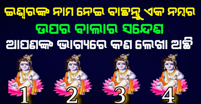 ପ୍ରତ୍ଯେକଟି ବ୍ୟକ୍ତି ଜୀବନରେ ସୁଖ ସହିତ ଦୁଃଖ ମଧ୍ୟ ରହିଥାଏ । ବ୍ୟକ୍ତିର ଜୀବନ ସମସ୍ଯା ତ ଆସିଥାଏ । ହେଲେ ସେହି ସମସ୍ଯାକୁ ସମାଧାନ କରିବା ପାଇଁ ଭଗବାନ ସାହାଜ୍ଯ ମଧ୍ୟ କରିଥାନ୍ତି । ତେବେ ଆଜି ଆପଣଙ୍କୁ ଆମେ ଏଠାରେ କହିବା ପାଇଁ ଯାଉଛୁ । ଭଗବାନ ଆପଣଙ୍କୁ କେଉଁ ପ୍ରକାର ସନ୍ଦେଶ ଦେବା ପାଇଁ ଯାଉଛନ୍ତି । ଏଥିପାଇଁ ଆପଣଙ୍କୁ 1 ଠାରୁ 4 ନମ୍ବର ପର୍ଯ୍ୟନ୍ତ କୌଣସି ଏକ ନମ୍ବରକୁ ଭଗବାନଙ୍କୁ ସ୍ମରଣ କରି ବାଛି ନିଅନ୍ତୁ ।