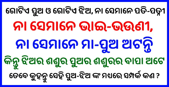 Interesting Gk Questions- ଗୋଟିଏ ପୁଅ ଓ ଗୋଟିଏ ଝିଅ, ନା ସେମାନେ ପତି-ପତ୍ନୀ, ନା ସେମାନେ ଭାଇ-ଭଉଣୀ, କିନ୍ତୁ ଝିଅର ଶଶୁର ପୁଅର ଶଶୁରର ବାପା, କୁହନ୍ତୁ ସେମାନଙ୍କ ମଧ୍ୟରେ ସମ୍ପର୍କ କଣ ?