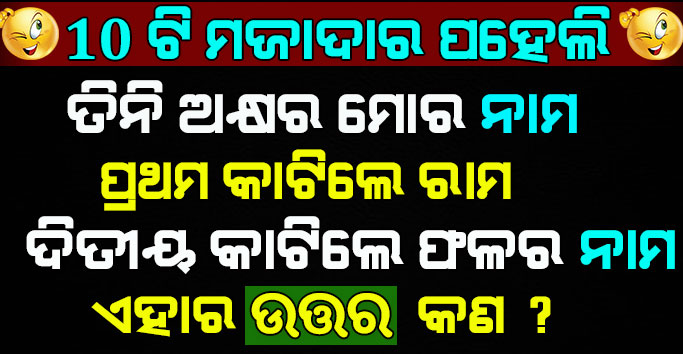 9- ତିନି ଅକ୍ଷର ମୋର ନାମ । ପ୍ରଥମ କାଟିଲେ ରାମ । ଦିତୀୟ କାଟିଲେ ଫଳର ନାମ । ଏହାର ଉତ୍ତର କଣ ?