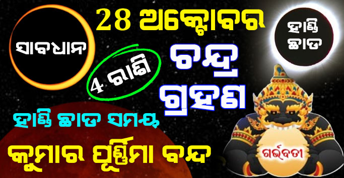 ପୂର୍ଣ୍ଣିମା ଓ ପ୍ରତିପଦା ତିଥିର ସନ୍ଧି ସ୍ତଳରେ ହିଁ ଗ୍ରହଣ ଲାଗିଥାଏ । ତେଣୁ 28 ତାରିଖ ଦିନ ରାତି 1 ଟା 5 ମିନିଟରେ ଗ୍ରହଣର ସ୍ପର୍ଶ ସମୟ ଆରମ୍ଭ ହେବାକୁ ଯାଉଛି । ଚନ୍ଦ୍ର ଗ୍ରହଣ ସମୟରେ 3 ପ୍ରହର ପୂର୍ବରୁ ପାକ ତ୍ୟାଗ କରିବାର ବିଧି ରହିଥାଏ । ଯଦି 1 ପ୍ରହର 3 ଘଣ୍ଟା ହୁଏ, ତେବେ 3 ପ୍ରହରର 9 ଘଣ୍ଟା ହୋଇଥାଏ । ଗ୍ରହଣର ସ୍ପର୍ଶ ସମୟ ଠାରୁ 9 ଘଣ୍ଟା ପୂର୍ବରୁ ଦେବନୀତି ଓ ପାକତ୍ୟାଗ କରିବାକୁ ପଡିବ ।