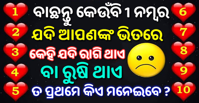 ବାଛନ୍ତୁ ନିଜ ପସନ୍ଦର କୌଣସି ଗୋଟିଏ ନମ୍ବର ଓ ଜାଣନ୍ତୁ ଯଦି ଆପଣ ଓ ଆପଣଙ୍କ ପାର୍ଟନରଙ୍କ ମଧ୍ୟରେ ଯଦି କେହି ରାଗିଯାଏ ତ ପ୍ରଥମେ କିଏ ମନେଇବ ? Love Quiz Game